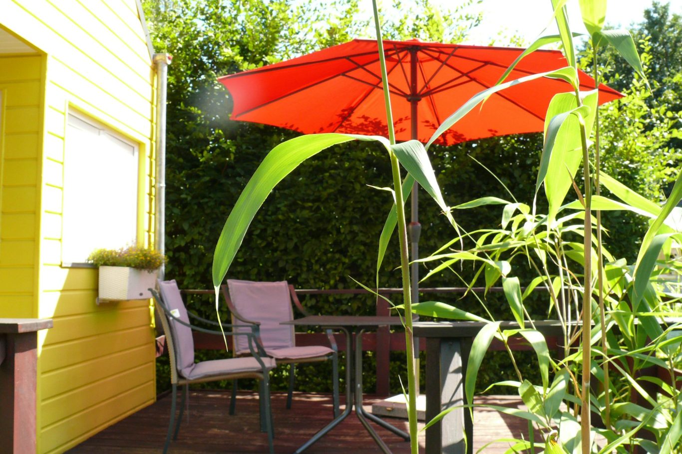 Zum Haus gehört eine kleine Rasenfläche; Hecken und Sträucher rahmen das Grundstück blickdicht nach drei Seiten ein. Nach vorne gehört Ihnen während Ihres Aufenthalts die große Sonnenterrasse. Im Gartenhaus finden Sie alles, was Sie im Außenbereich brauchen - Sonnenschirm, Stühle, Liegen, Tische - bis hin zum Grill. Eine Schotterfläche dient als Parkplatz direkt am Haus.