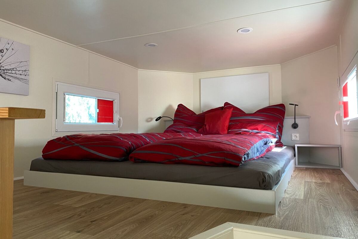 Auf 24 qm ist alles da. Highlight ist das Schafloft: Erwachen Sie langsam, schieben Sie vom Bett aus die Plissées zurück und schauen Sie ins Grüne.